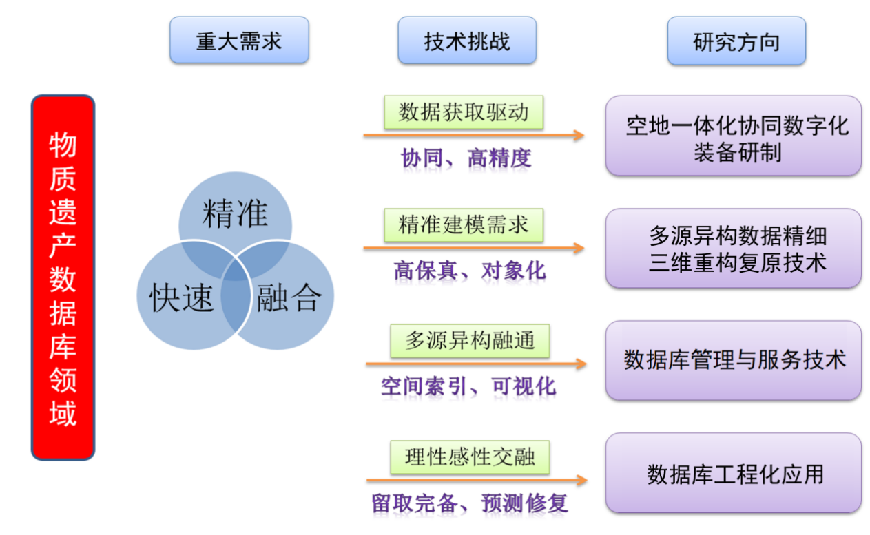 中心面向代表性建筑与古建筑数据库的关键科学与技术问题,聚焦建筑遗产数字化保护与传承等行业重大需求,针对建筑遗产数字化保护领域的技术挑战,在空地一体化协同数字化装备研制、多源异构数据精细三维重构与复原技术、数据库管理与服务技术和数据库工程化应用4个研究方向上开展应用基础研究、新技术研发和工程转化等工作。