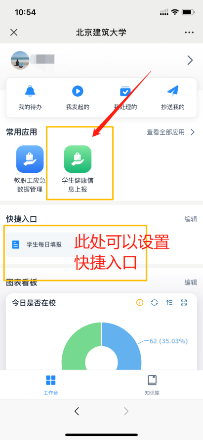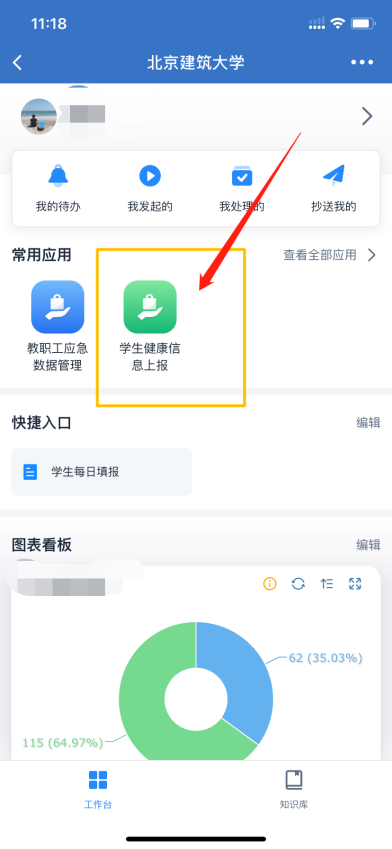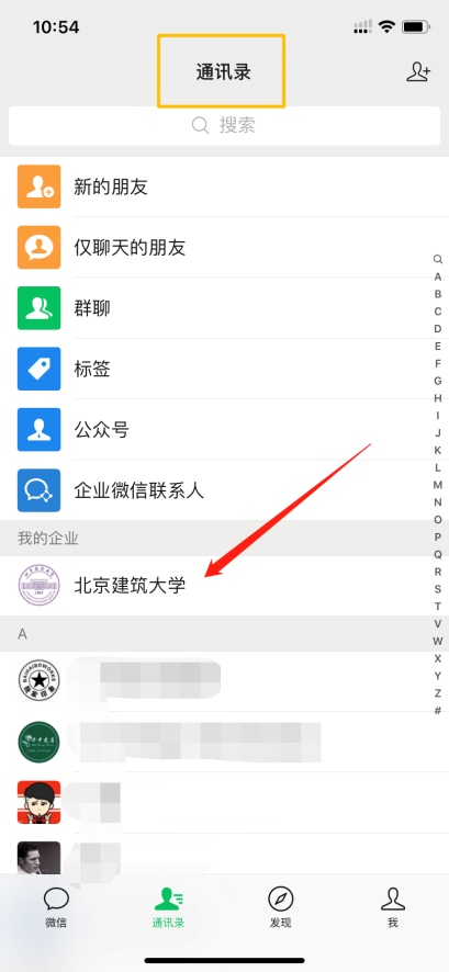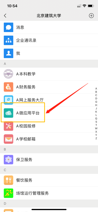学生打开微信—通讯录—北京建筑大学(企业微信号)—A微应用平台—学生健康信息上报。