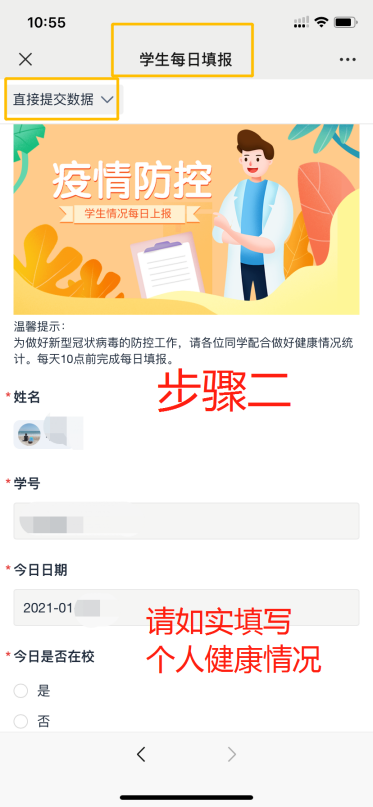 2、填报时间:全体学生(休学学生除外)每日均需填报,填报时间为当日0:00-10:00。