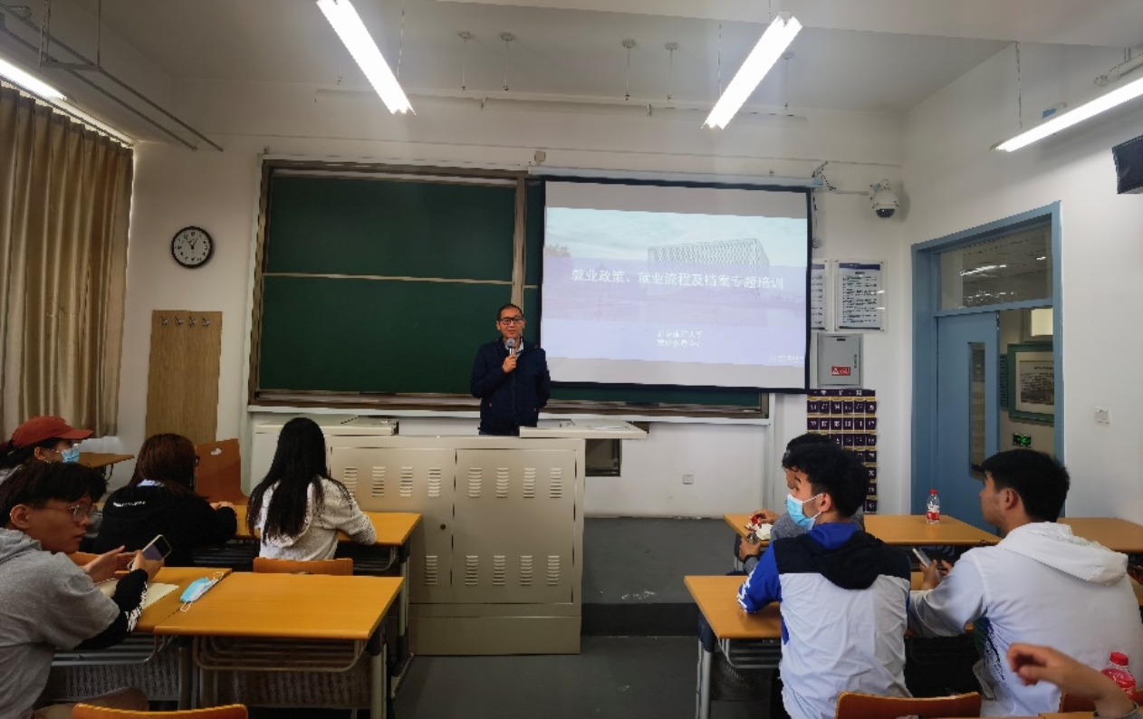 王国亭围绕就业政策、就业流程、户口及档案派遣等方面进行了介绍。他对就业时间节点进行重点强调,嘱咐同学们一定规划好自己的时间,并从几种常见的就业形式及办理所需材料入手,结合就业推荐表、三方协议的填写、毕业生签约及就业信息审核流程等方面的问题,给大家做了详细的说明。他就有关问题进行了解答,预祝每一位同学都能收获心仪的成果。