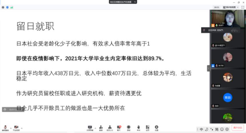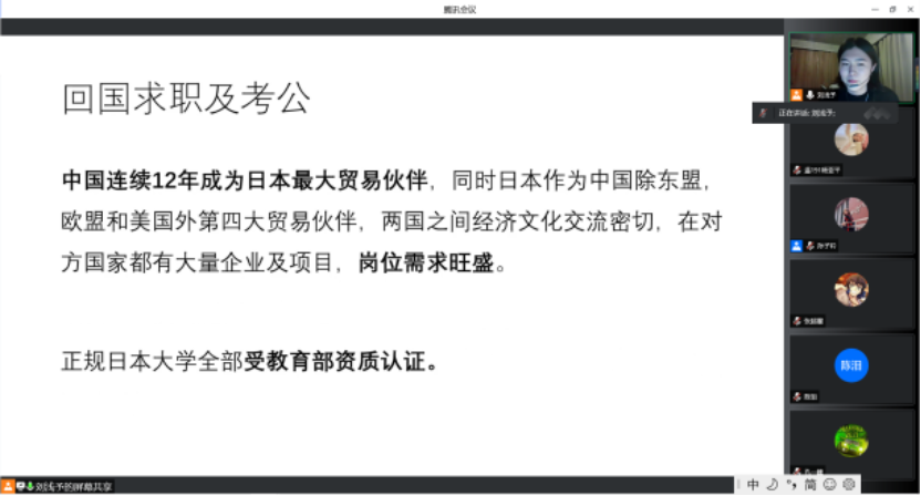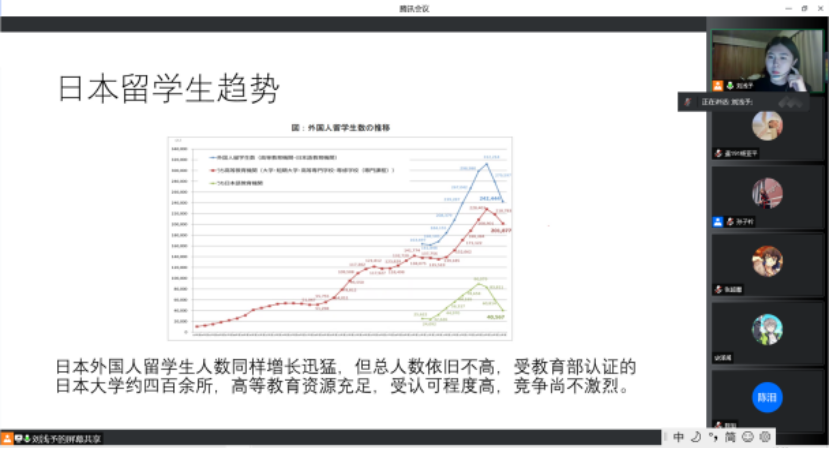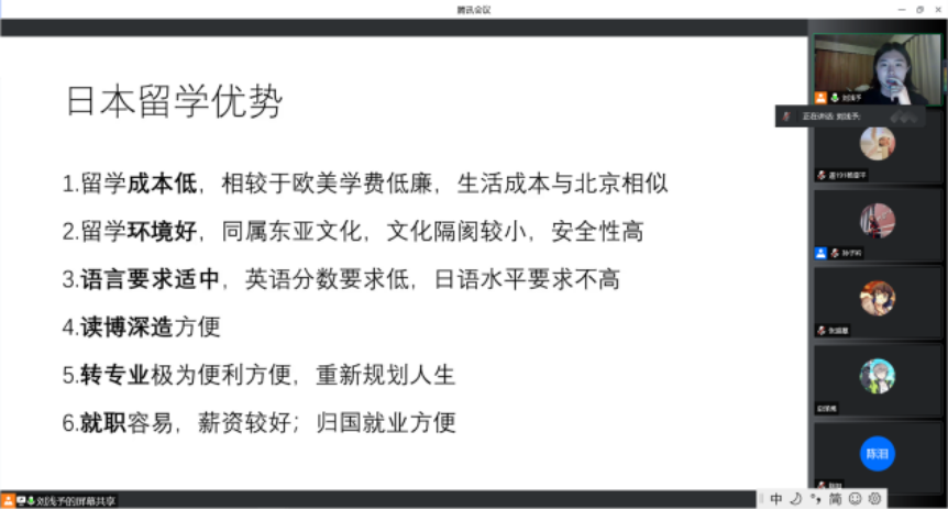 为帮助有留学需要的同学们做好出国准备工作,帮助同学进一步掌握留学申请流程、专业对口院校等相关信息,博雅德州扑克官网 于5月12日晚19:00线上召开了日本留学宣讲会,特邀请2018届毕业生刘浅予进行留学分享,会议由辅导员孙子衿主持。宣讲会吸引了来自测绘、经管、建筑、电信等博雅德州扑克 的40余名学生参加。