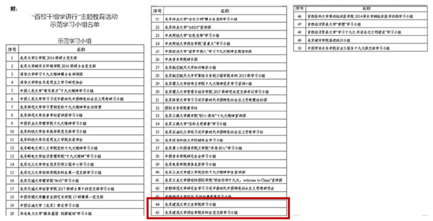“百校千组学讲行——党的十九大精神 我学我讲我践行”主题教育活动是市委教工委于2017年11月-2018年1月组织开展的,以深入学习贯彻党的十九大精神,在首都大学生中掀起学习党的十九大精神热潮为宗旨的专项教育活动。活动开展以来,各高校积极行动,精心组织,依托基层党支部、班团组织、科研团队和理论社团等基层组织,组建了5800余个学习小组,累计开展16000余次活动,参与学生数量超过60万人。在本次评选活动中,共有145个学习小组进入专家评审环节,共评出50个示范学习小组,其中我校两个学习小组成功入选。