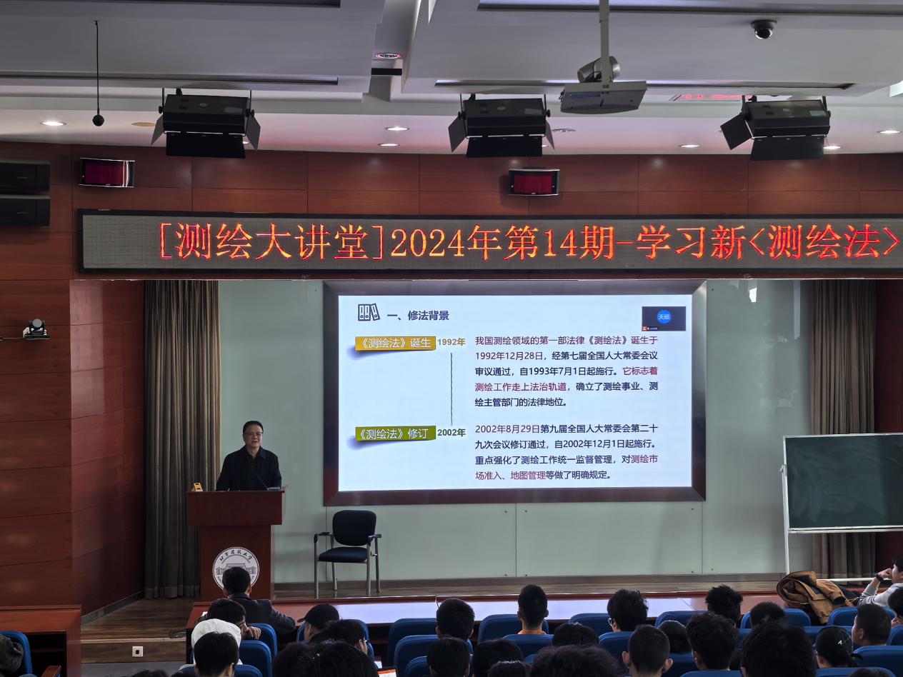 10月22日,博雅德州扑克官网 于学E报告厅举办了2024年第14期测绘大讲堂之“以法治护航新时代 测绘地理信息产业--学习新《测绘法》”主题讲座。本次讲座邀请了中国测绘学会理事长宋超智作为主讲人,讲座由我院党委书记王坚主持,党委副书记谷天硕、辅导员魏洋洋、24级全体本科生以及部分研究生现场聆听,部分校友、师生线上参加。