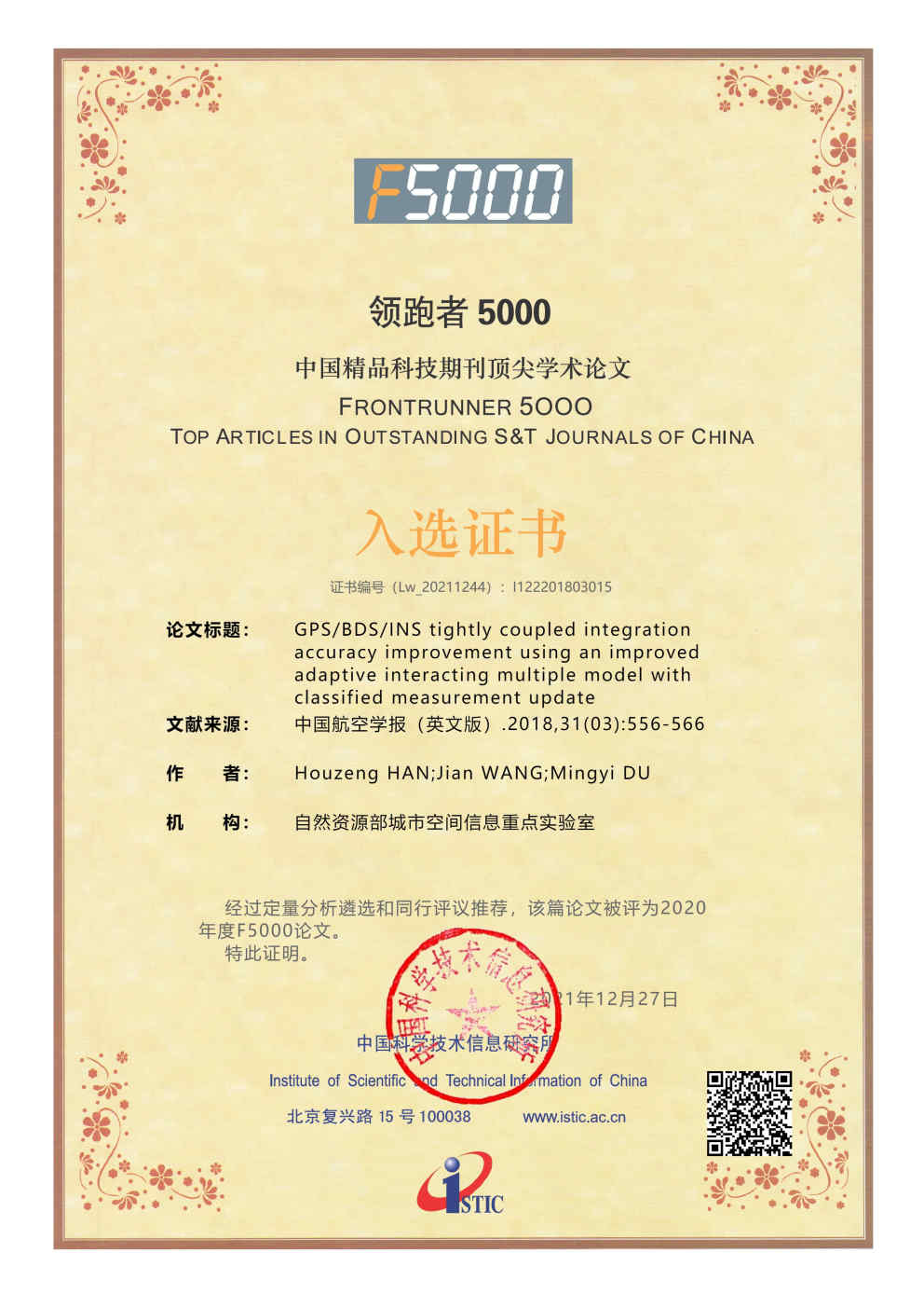 2021年12月27日,中国科学技术信息研究所在北京召开2021年度中国科技论文统计结果发布会,会上公布了 “领跑者5000—中国精品科技期刊顶尖学术论文”的入选名单,并为入选者颁发了获奖证书。由我院韩厚增、王坚和杜明义共同在《中国航空学报(英文版)》上发表的学术论文《GPS/BDS/INS tightly coupled integration accuracy improvement using an improved adaptive interacting multiple model with classified measurement update》成功入选,也是我院成果首次入选“领跑者5000—中国精品科技期刊顶尖学术论文”,代表着测绘地理信息领域高水平、原创性技术成果。