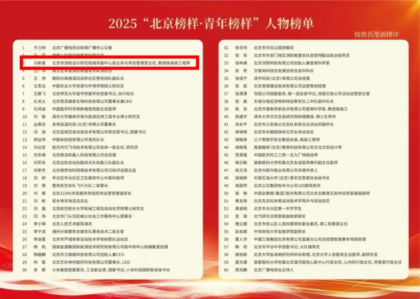 近日,2025“北京榜样·青年榜样” 人物榜单正式揭晓,全市各领域60名优秀青年脱颖而出,成为新时代首都青年奋勇前行的闪耀标杆,我院2011届毕业生马新建光荣入选!