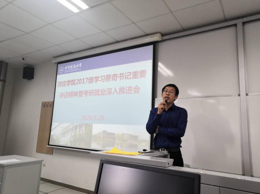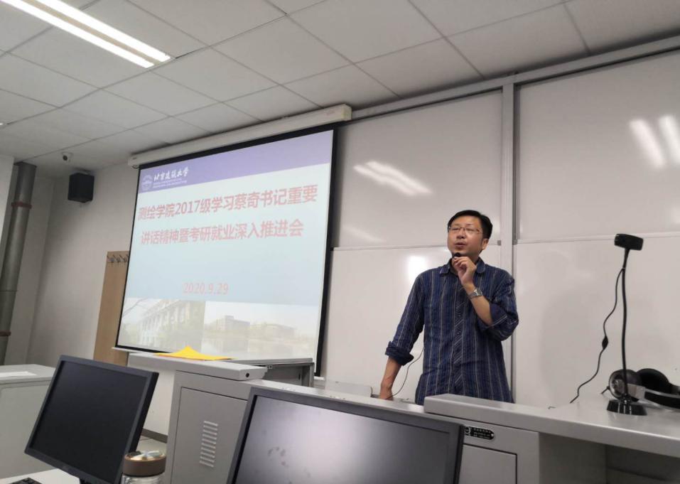 为深入学习蔡奇书记调研北建大重要讲话精神,同时促进2021届毕业生考研就业工作顺利进行, 9月30日下午,博雅德州扑克官网 在大兴校区基B310召开2021届毕业生学习重要讲话精神暨考研就业深入推进会。博雅德州扑克官网 党委副书记冯永龙、副院长刘祥磊、团委书记李晨以及2017级全体学生参加会议。