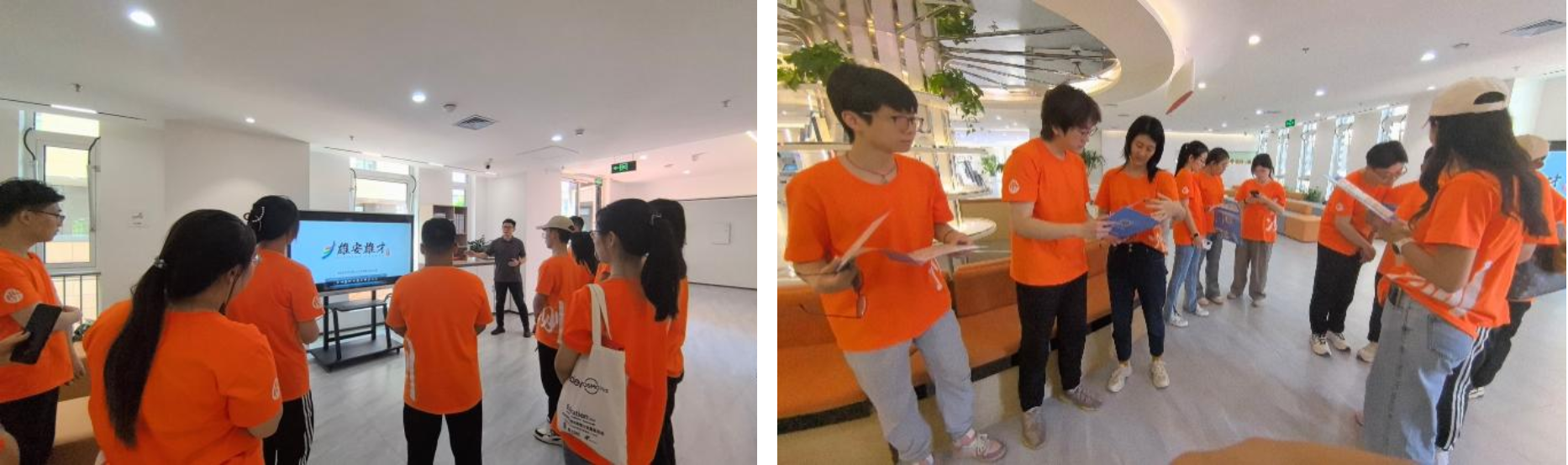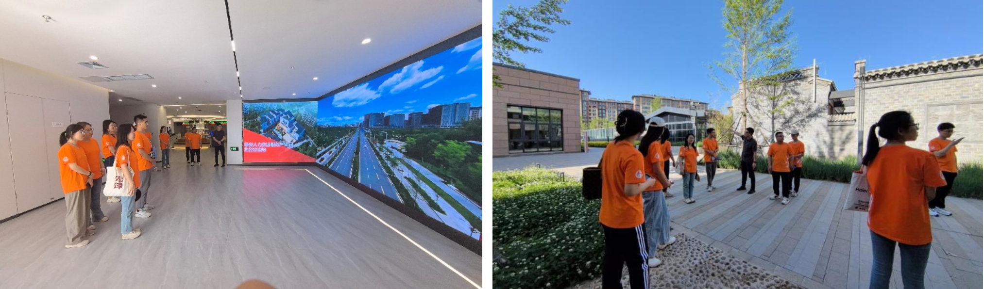 在产业园区工作人员伍思磊的带领下,参观了产业园的展厅和各大功能区域。展厅内,一幅幅生动的图片和详细的文字介绍,让同学们对雄安新区的战略规划、产业布局以及人力资源产业园的建设背景有了直观的认识。随后,他们深入了解了产业园在人才引进、培训、服务等方面的创新举措和显著成效。