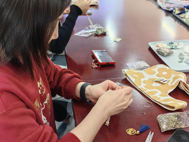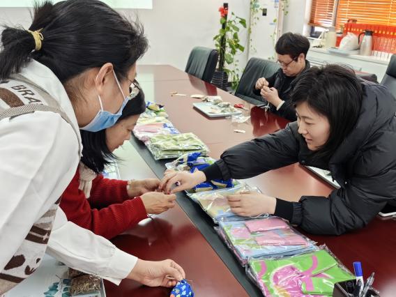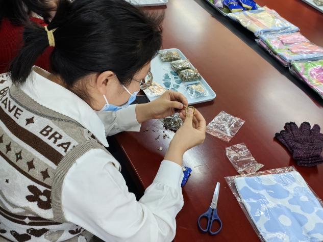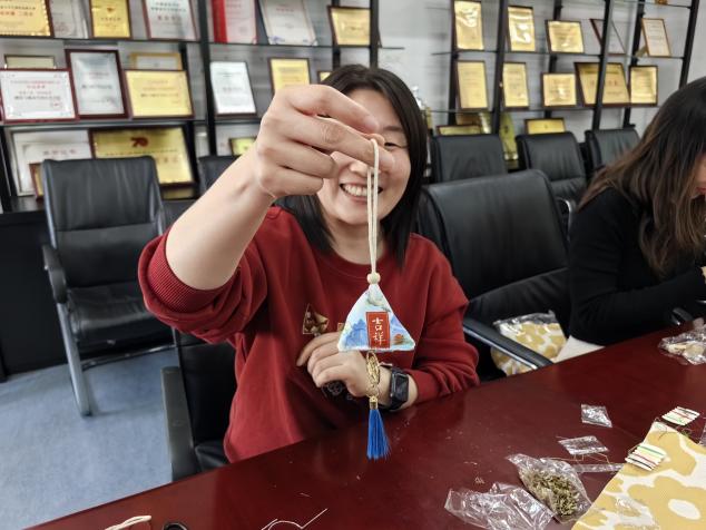 活动伊始,大家根据现场制作步骤图,从布料选择到针法教学,从药材配比到流苏装饰,女教师们化身"非遗传承人",穿针引线间尽显专注。老教师主动指导年轻同事锁边技巧,欢声笑语中交织着艾草清香,活动现场洋溢着温馨互助的暖意。