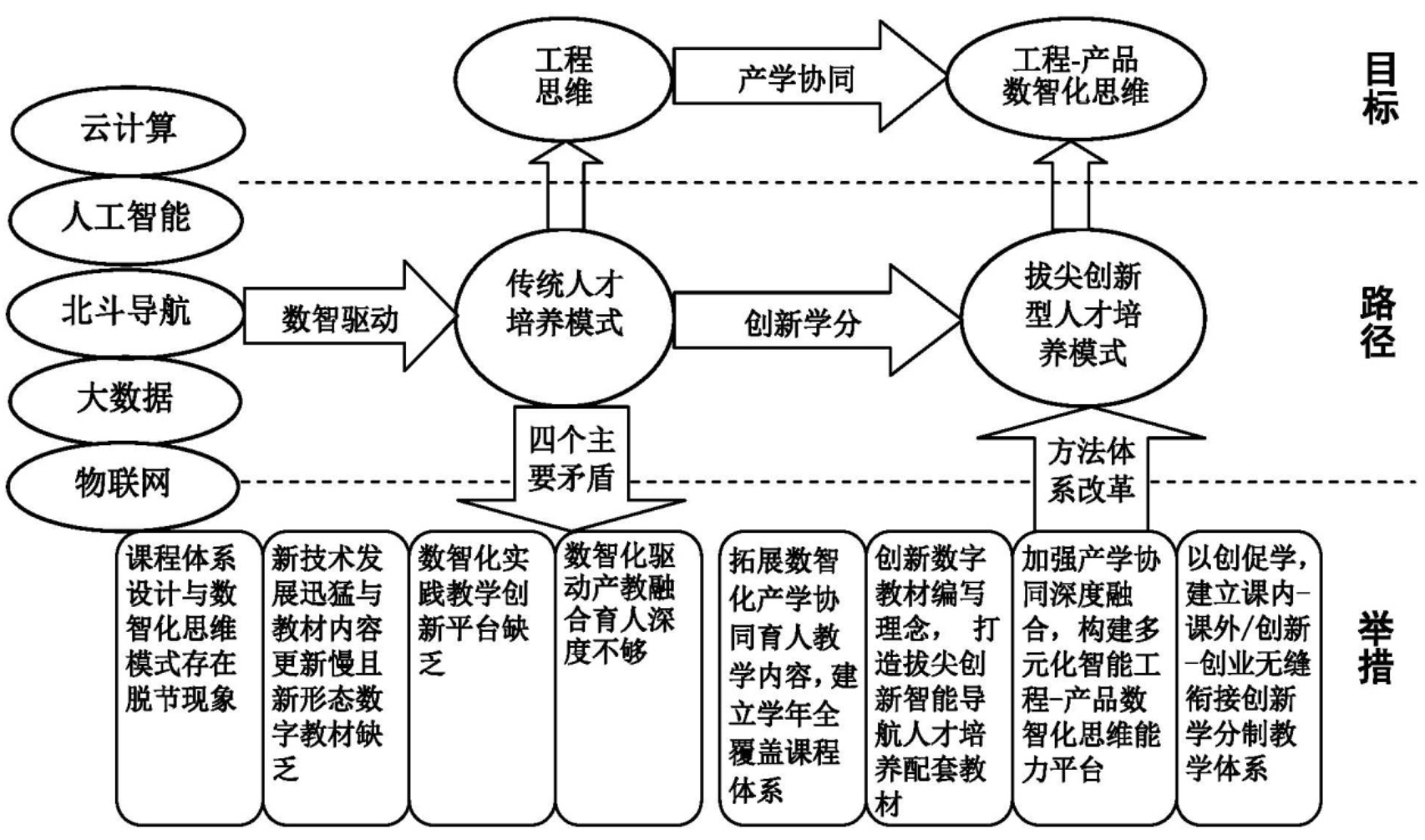 随着北斗导航、人工智能、大数据等新技术的发展,传统人才培养模式难以满足测绘导航专业发展新要求,该成果通过数智驱动测绘导航专业建设的内涵与外延,积极推动专业学科由工程向工程-产品的思维融贯,主动发挥课程思政全覆盖作用,围绕“课程体系、教材建设、实践教学及创新创业”进行教学改革,构建了面向新工科测绘导航拔尖创新型人才培养模式(图1),通过拓展数智化产学协同育人教学内容,建立测绘导航学年全覆盖课程体系,克服了课程体系设计与数智化思维培养模式存在脱节现象;创新教材编写理念,融入课程思政,打造测绘导航拔尖创新型配套教材体系,解决了新技术发展迅猛与教材内容更新慢的矛盾以及课程思政新形态数字教材缺乏问题;加强产学协同深度融合,构建多元化智能工程-产品数智化思维能力培养平台,破解了数智化实验教学创新平台缺乏难题;以创促学,建立课内-课外/创新-创业无缝衔接的创新学分制教学体系,突破了数智化驱动产教融合育人深度不够瓶颈。