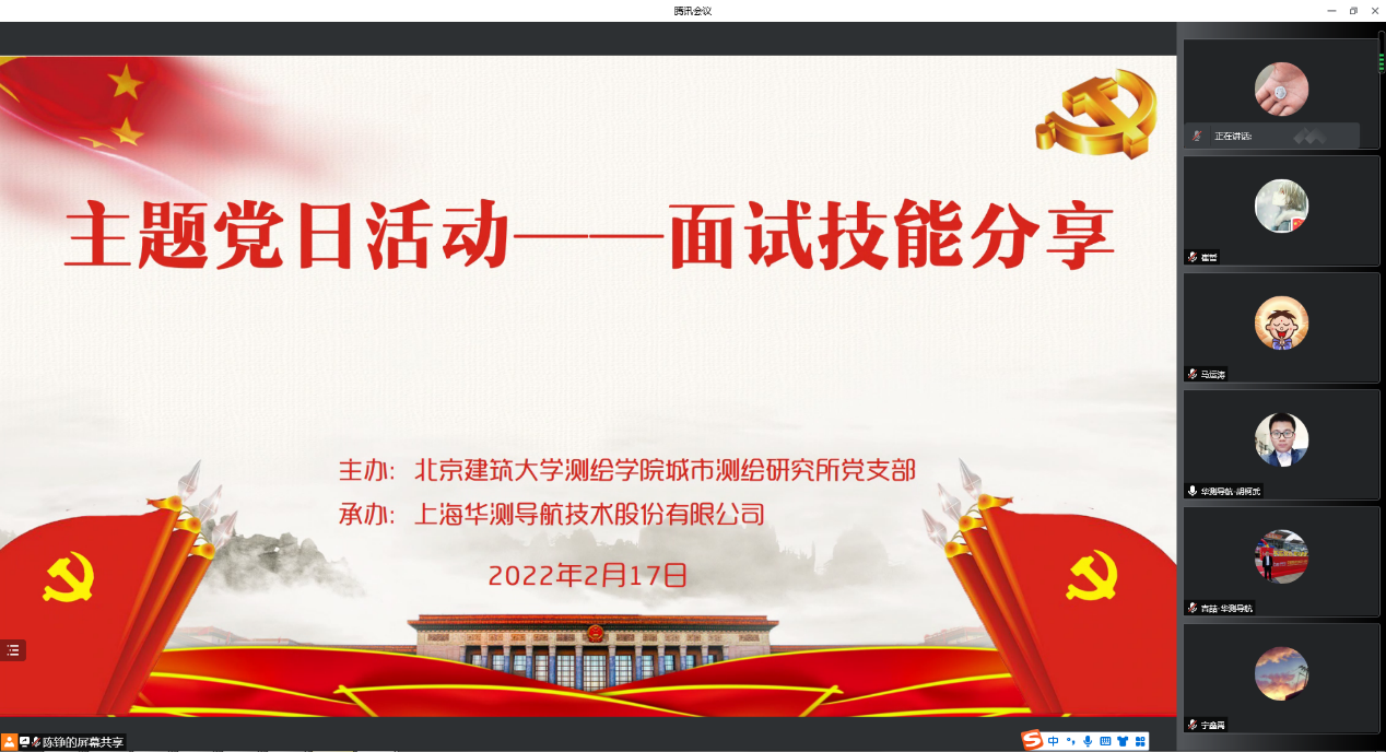 为进一步深入贯彻落实习近平总书记“七一”重要讲话精神,对照“九个必须”根本要求,扎实开展“我为群众办实事”活动,2月17日,博雅德州扑克官网 城市测绘研究所党支部就求职面试技能分享召开主题党日活动。本次活动邀请了上海华测导航技术股份有限公司人力资源部经理胡柯武分享面试技巧。会议采用线上模式,由支部书记陈铮主持。参加本次活动的有博雅德州扑克官网 党委副书记谷天硕、上海华测导航北京分公司经理吉喆,此外还有博雅德州扑克官网 师生党员代表20余人。