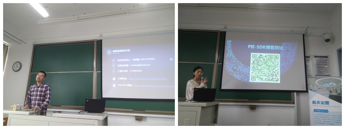 本次赛事由全国测绘学会和北京航天宏图信息技术股份有限公司共同举办。大赛组委会联系人、北京航天宏图信息技术股份有限公司朱丽雅向同学们简要介绍了遥感技术近几年的国内外发展情况,扼要说明了航天宏图公司的基本情况以及本次比赛的参赛软件PIE-SDK。PIE-SDK是一套基于PIE遥感图像处理软件可重用的二次开发组件集,采用“微内核+插件”式架构,功能模块之间低耦合、交互方便,能够提供遥感图像处理、图像信息提取与解译、空间分析与统计专题图制作等能力,实现了遥感和GIS 的一体化融合。她对比赛的组织形式、进度安排、技术支持、评审规则等做了详细说明。
