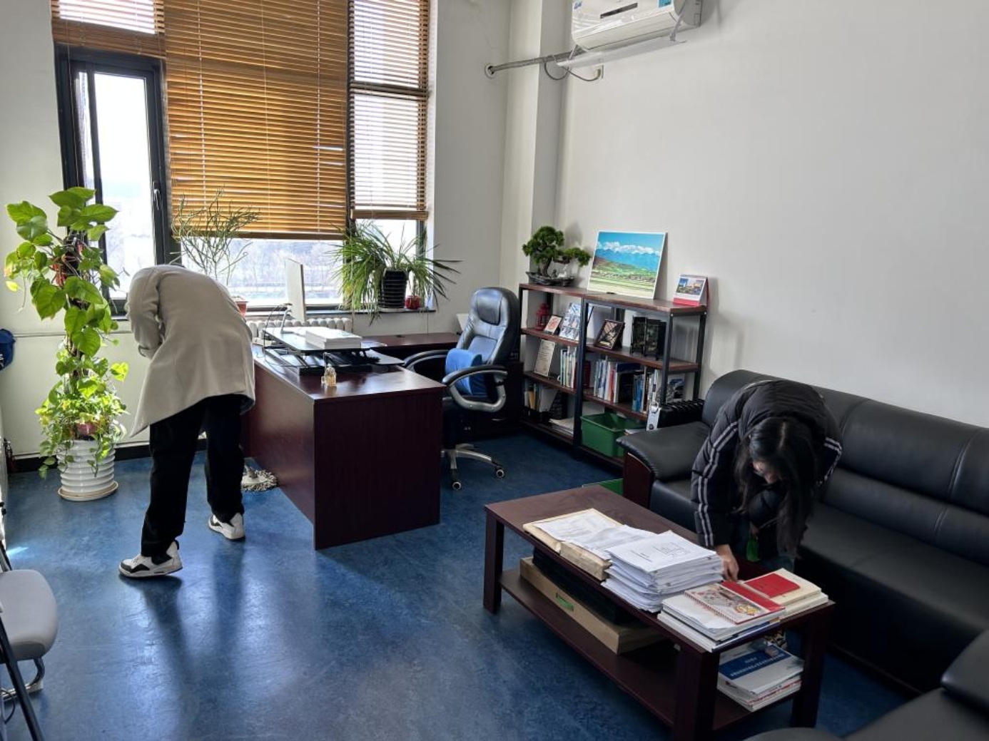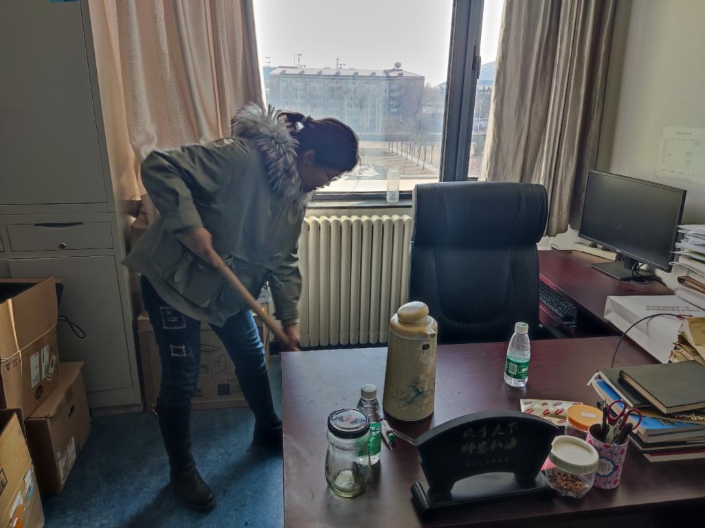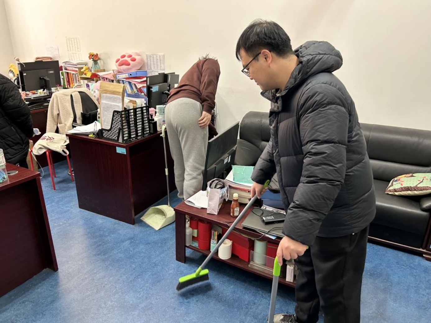 在分好工后,同学们迅速展开工作。他们分工合作,不畏脏不怕累,积极地进行扫地、擦窗、整理书桌等劳动。有的同学细心地清扫每一个角落,有的同学用抹布擦拭窗户,还有的同学在整理凌乱的书籍。大家齐心协力,干劲十足,整个办公室焕然一新。