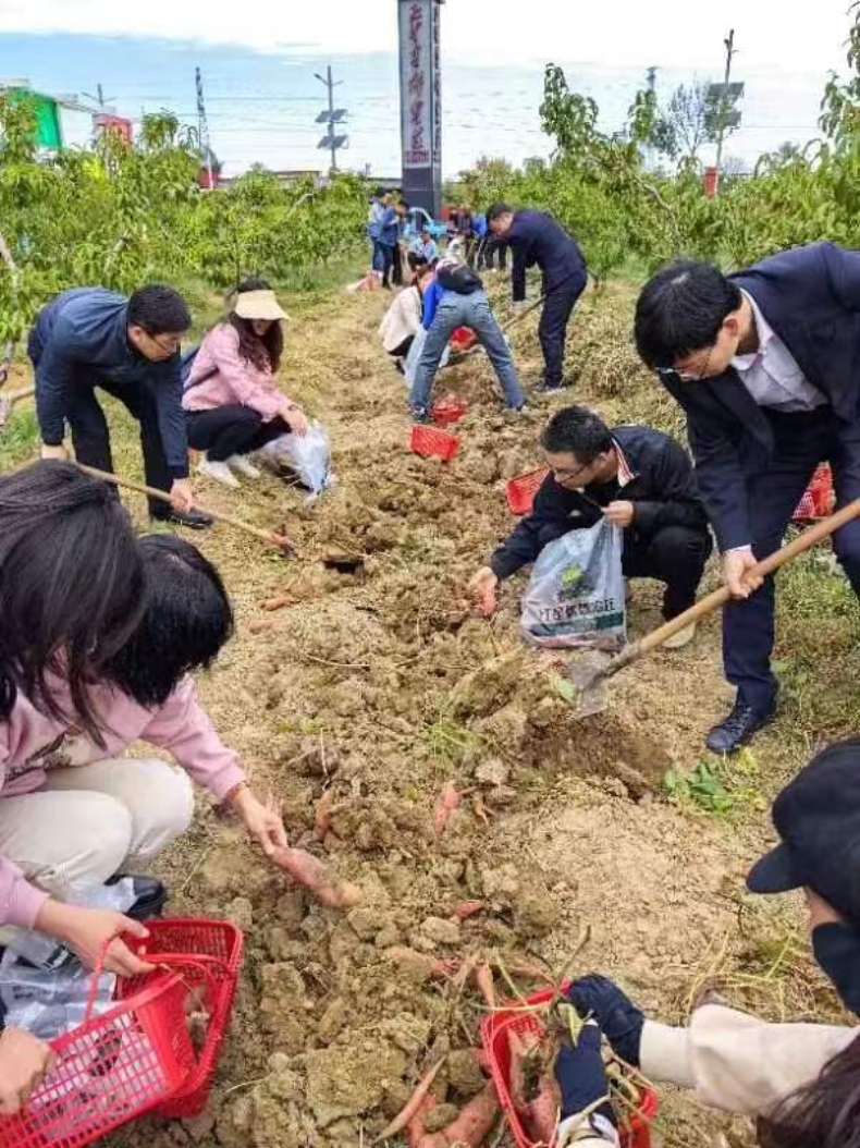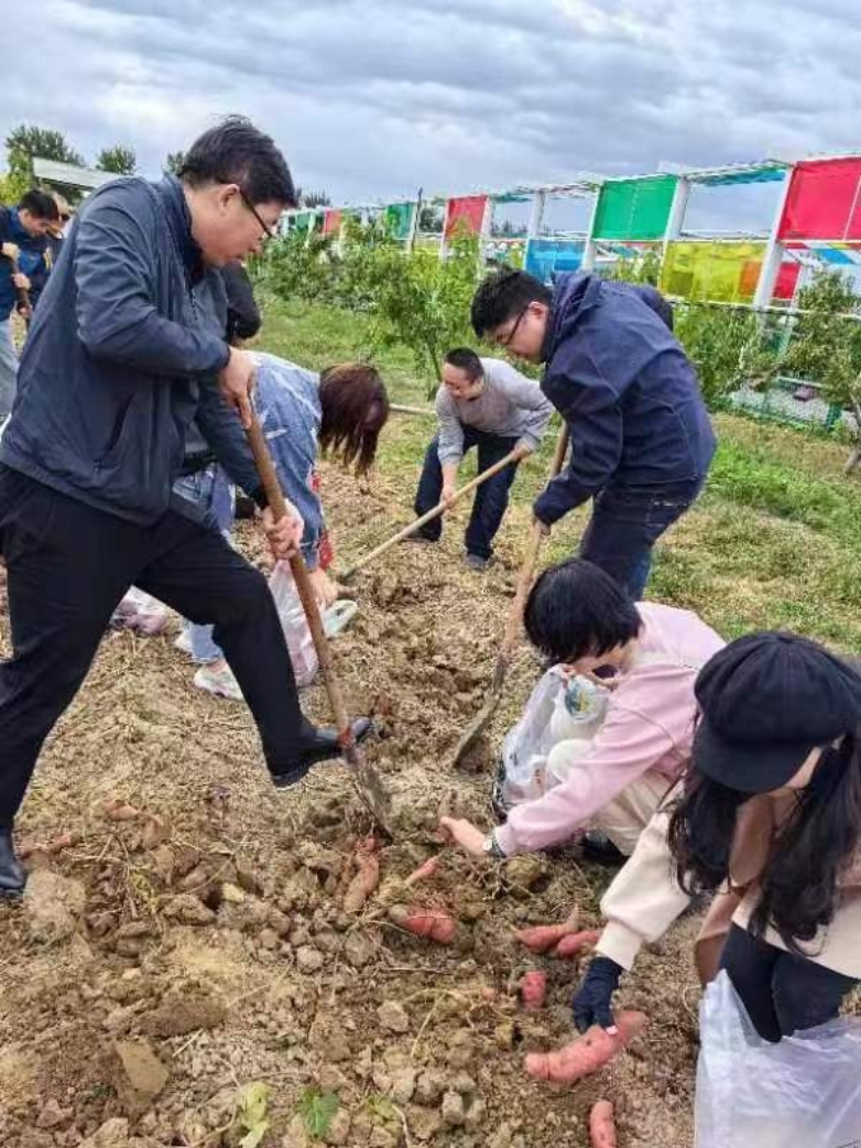 上午老师们抵达大兴区红星集体农庄红薯种植地。天高云淡,风和日丽,大家欢快地走在散发阵阵泥土清香的垄间,男老师迫不及待的拿起铁锹,认真刨开上面的土壤开挖,女老师跟在旁边小心的抖去泥土,将红薯们轻轻放入筐中。大家一边劳动一边畅谈着,分享着挖红薯的技巧、红薯种植与食用的小知识、工作和生活中的趣事,田间欢声笑语不绝于耳。