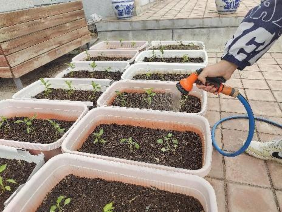 经过同学们数日的精心呵护,小小的种子纷纷破土而出,长出嫩绿的小芽。阳光普照,洒在每一片充满生机的土壤之上,同学们手持喷水枪,忙碌而有序地为菜苗浇水。水珠洒在嫩绿的叶子上,闪烁着晶莹的光泽。空气中弥漫着泥土的清新气息,令人心旷神怡。这一刻,同学们感受到了生命的奇迹,也体验到了付出与收获。大家的脸上洋溢着期待与喜悦!