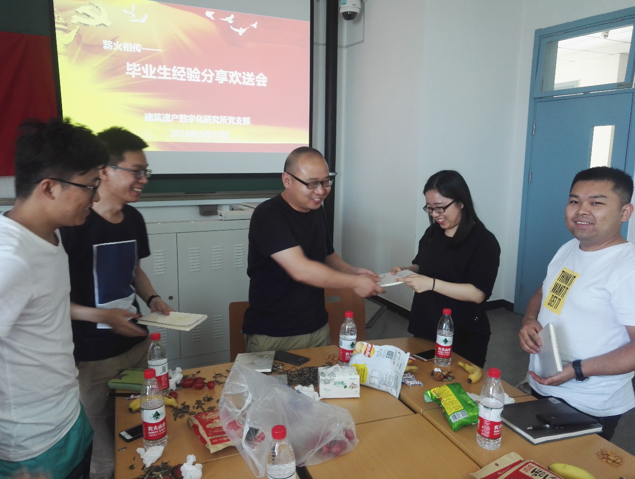 此次经验分享与欢送会在欢声笑语和依依惜别情感交织的氛围中圆满落下了帷幕,本次交流会不仅是2018届建筑遗产数字化研究所党支部毕业生党员的欢送会,更是一场集体的交流学习会,通过分享优秀毕业生党员成长经历,为党支部成员以及群众树立标杆,进一步明确自身努力的方向,同时提高了党支部的凝聚力,增进成员间的友谊,丰富大家课余活动,为同学之间的相互学习提供了平台!