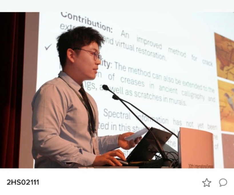 硕士研究生马顺做了关于《Digital Conservation of Ancient Woodblock CombiningHyperspectral Imaging and Closerange Photogrammetry Technology》的报告。以古代木版为研究对象,提出融合高光谱成像与近景摄影测量的数字化保护方案。研究通过暗通道算法增强木版影像细节,并引入曲率函数与边界函数改进修复算法,有效解决了传统方法对结构信息考虑不足的问题。在清代乾隆年间的大藏经木版上开展实验,成功恢复了模糊和缺失的文字与纹饰。该成果为珍贵木版文献的数字修复与长期保存提供了可行的技术路径。