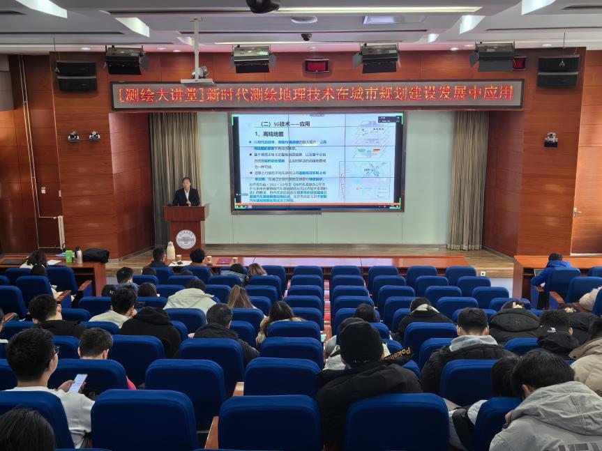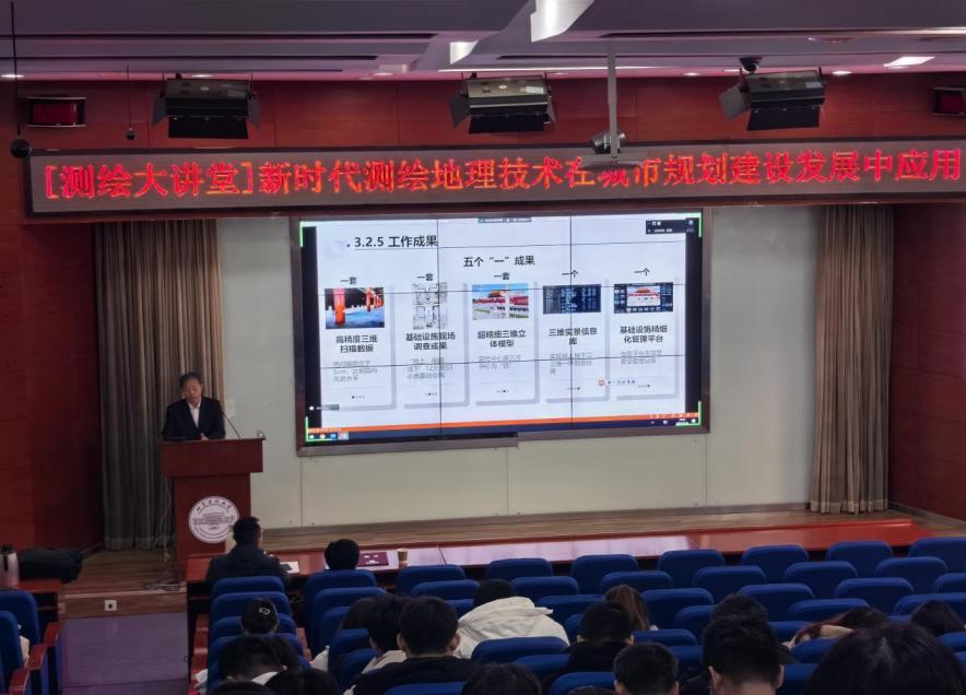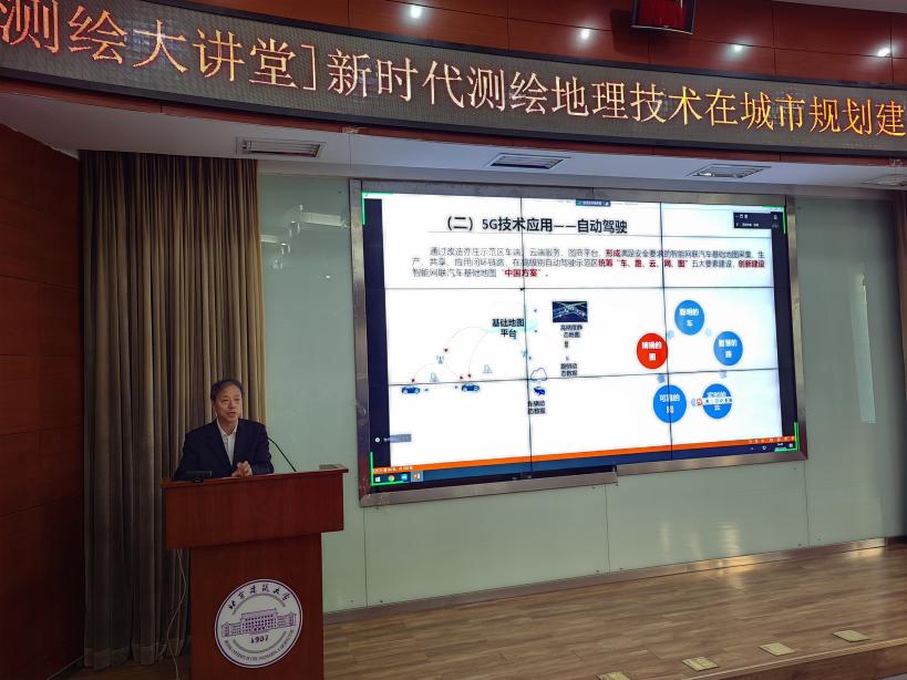 杨伯钢向同学们讲述了由古代测绘到智能化测绘不同阶段的发展历程。他介绍到,测绘信息已经发展成了全链条产业,测绘从信息化走向智能化是必然的趋势。他强调,测绘地理信息技术发展十分迅速,它可以与众多新一代技术相融合产生如大数据、物联网、自动驾驶、云计算、实景三维等不同的应用场景。