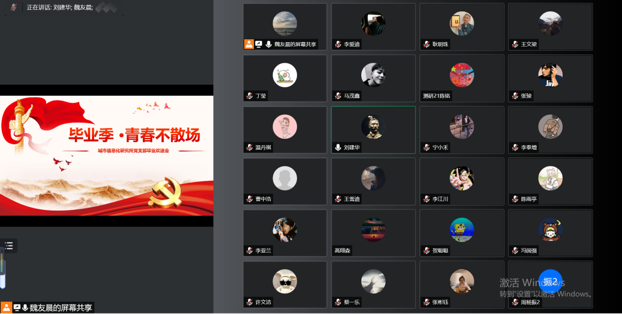 六月,茧破成蝶,花放香远。为祝贺2022届学子顺利毕业,勉励学子们不畏前路难,更上一层楼,城市信息化研究所党支部2022届毕业生欢送会于6月7日上午10时通过网络形式顺利举行,全研究所师生在“云端”共同庆祝这一美好时刻!支部书记刘建华及所有支部成员共同参加了本次欢送会。会议由支部副书记魏友晨主持。