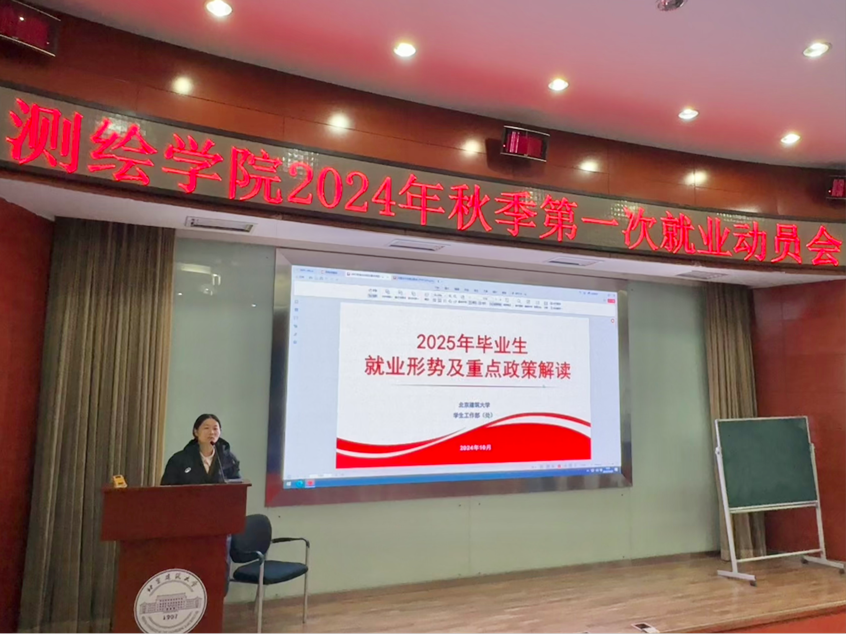 为贯彻落实我院毕业生就业工作部署,扎实有效做好2025届毕业生就业指导工作。2024年10月22日,博雅德州扑克官网 在土木报告厅举办2024年秋季第一次就业动员会。会议由党委副书记谷天硕主持,学校就业中心张巧老师、中关村空间信息产业技术企业联盟孙燕萍及2025届毕业生参加会议。