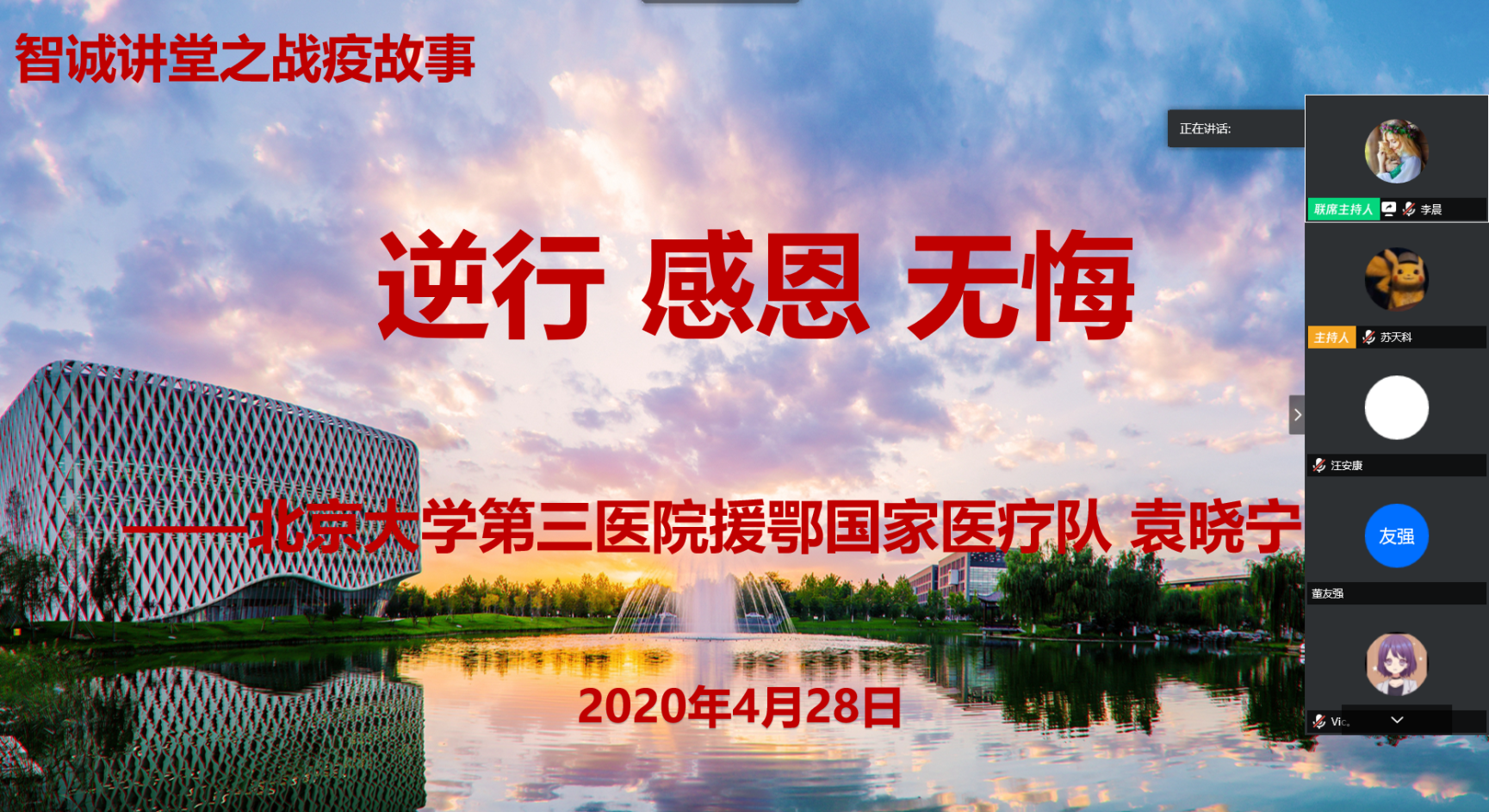 4月28日下午,博雅德州扑克官网 与机电博雅德州扑克 联合举办北京大学援鄂国家医疗队抗疫故事报告会。北京大学第三医院援鄂抗疫国家医疗队党总支书记袁晓宁以“逆行、感恩、无悔”为题精彩讲述抗疫难忘经历。报告会吸引300余名师生参加。
