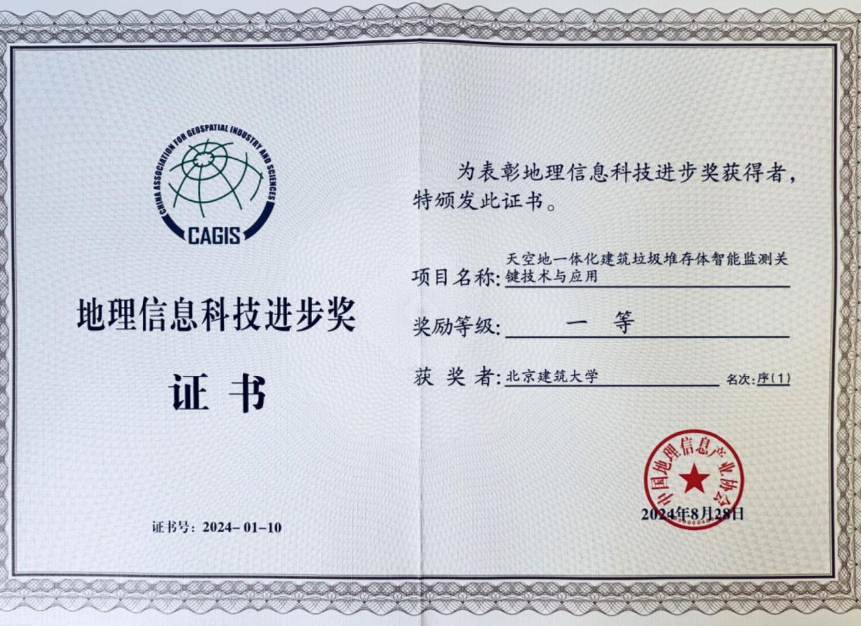 我校为第一完成单位的“天空地一体化建筑垃圾堆存体智能监测关键技术与应用”项目(陈强、杜明义、曹诗颂、刘扬、周磊、冯雨宁等教师和数名研究生共同完成)荣获地理信息科技进步奖一等奖。项目以遥感识别、体量估算、变化监测为研究主线,开展建筑垃圾堆存体遥感智能识别与监测研究,结合高低空遥感平台和地面移动平台,形成了天空地一体化建筑垃圾堆存体智能监测关键技术与应用的成套技术方案和系统平台,攻克了建筑垃圾多类型快速识别精度低、处理与资源再生利用底座数据缺失和堆存体关键指标应急响应和风险识别难等三大技术难题,成果服务于全国35个城市的建筑垃圾智能管控,显著提升了城市精细化管理水平!