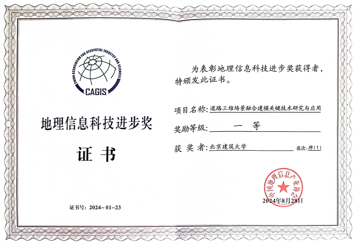 我校为第一完成单位的“道路三维场景融合建模关键技术研究与应用”项目(沈涛、刘祥磊等教师和数名研究生共同完成)荣获地理信息科技进步奖一等奖。项目组自2018年开始,本着“理论基础——关键技术——应用验证”的思路进行道路三维场景融合建模关键技术与应用的研究,以线性参照理论为基础,以道路三维场景的模型匹配、符号化表达和动态表达等关键技术为核心,以应用示范为技术验证,构建了道路三维场景融合建模的技术方法体系。形成的道路三维场景融合建模技术方法已成功应用于多项铁路、公路等重大道路工程的信息化精准管控、资产管理、指挥调度和应急救援,取得了显著的社会经济效益!