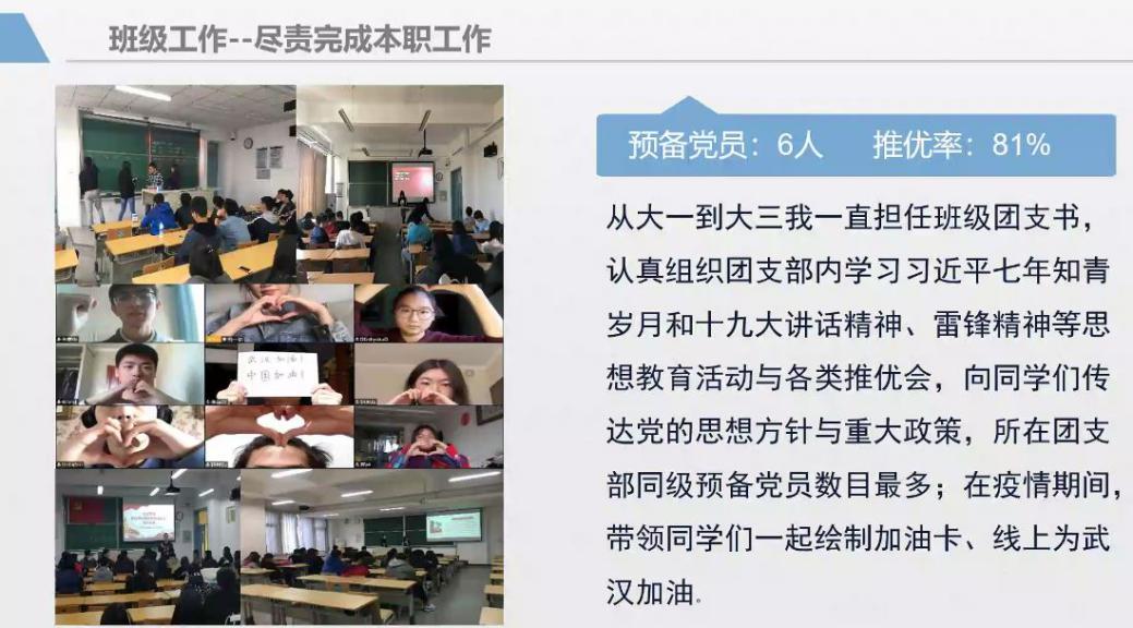 校十佳团支部代表—遥181班三郎斯基从支部情况、思想建设、取得成绩、课外实践、志愿实践、未来展望等方面进行了汇报。除此之外,团支部还积极组织同学参与疫情防控工作,担任所在社区义务志愿者,为抗击疫情贡献力量。
