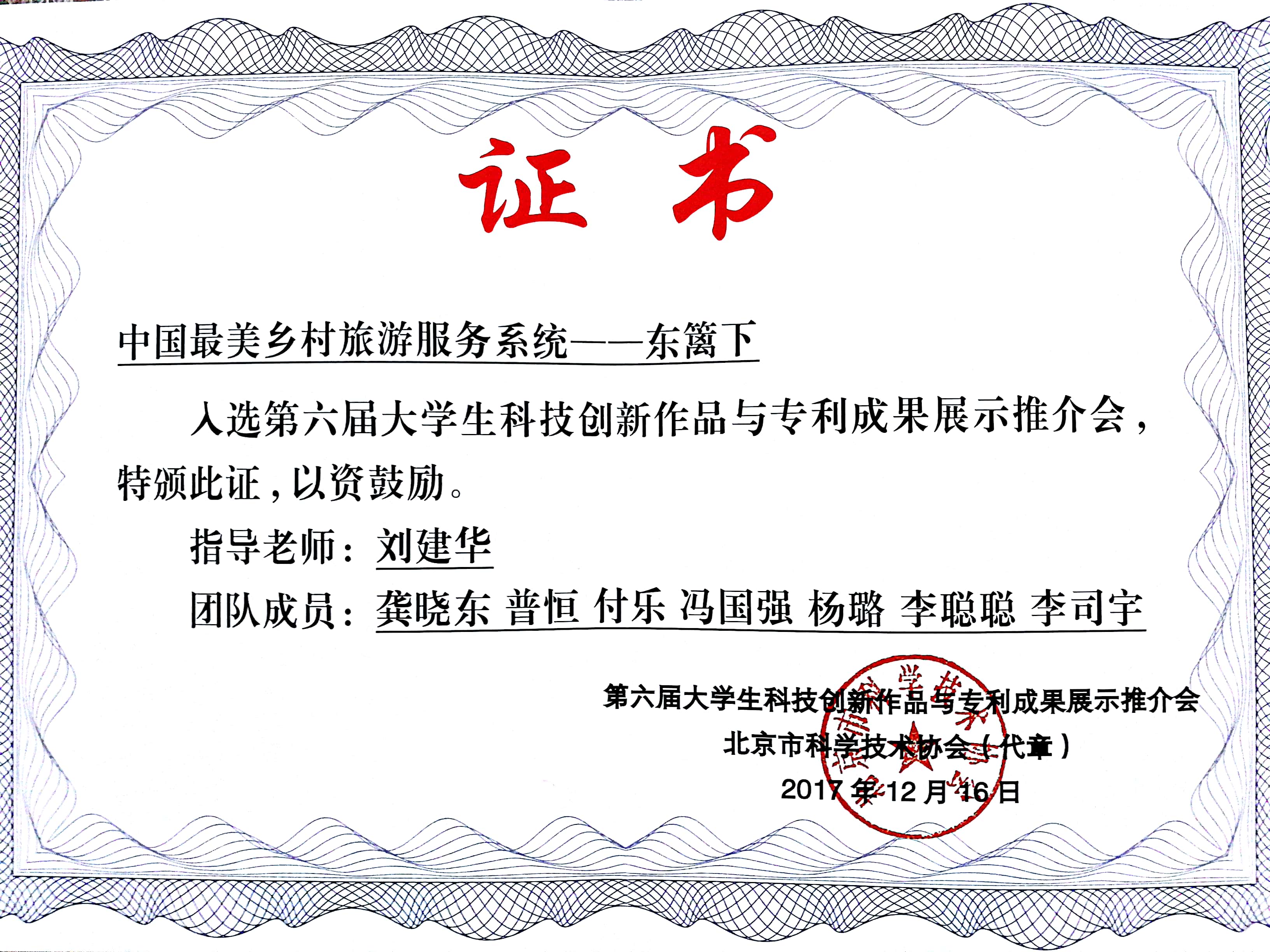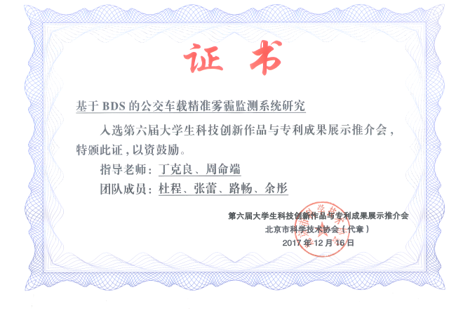 第六届大学生科技创新作品与专利成果展示推介会近日在中国农业大学举办,展期2天,博雅德州扑克官网 学生龚晓东、普恒、付乐、冯国强、杨璐、李聪聪、李司宇的公益作品《中国最美乡村旅游服务系统-东篱下》(指导老师:刘建华);杜程、张蕾、路畅、余彤撰著的学术作品《基于BDS的公交车载精准雾霾监测系统研究》(指导老师:丁克良、周命端)以及刘亚杰、鲍东东、罗麒杰、王彤、刘明亮、于龙昊、王来阳撰著的学术作品《高精度智能化测量数据采集与分析系统BJMOS》(指导老师:丁克良)成功入选。