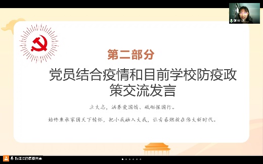 王震远老师作了总结讲话,他指出,目前学校处于疫情防控关键时期,感谢大家对学校疫情防控的配合与支持,同时也提出了三点希望:一是疫情期间保持身心健康,加强体育锻炼,调整好学习状态;二是在学业和疫情防控方面积极作为,发挥党员先锋模范作用,发挥桥梁纽带作用,关注好同学们思想动态;三是培养良好的读书习惯,多读书、读好书,构建良好的个人素养。最后要求大家,作为党员要时刻讲党性,做模范,发挥好榜样先锋作用。