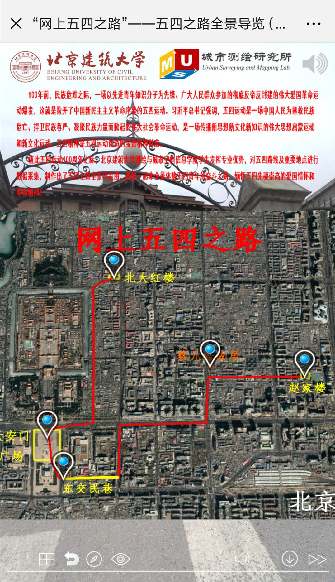 本学期以来,博雅德州扑克官网 在学生工作部、研究生工作部、团委等部门的大力支持下,组建了“网上五四之路”学生制作团队,主要由城市测绘研究所潘兴楠、李若鹏、张新宇等研究生和测绘工程专业张芷瑶、遥感科学与技术专业韩卉等本科生组成。团队聆听了马克思主义博雅德州扑克 孙希磊院长在“北大红楼”等地的精彩讲解,在指导老师李晨、黄鹤、冯永龙等指导下,实地走访“北大红楼”、“东交民巷”、“赵家楼”等五四精神发源地,用全景相机等专业设备采集建筑物和周边环境海量数据,认真收集展览展示各类材料,积极挖掘历史史料丰富素材,深入学习总书记重要讲话精神,用自己的专业知识制作了“网上五四之路”——五四之路全景导览,以全景导览的方式概要呈现出100年前波澜壮阔的五四之路的运动历程,抒发今天重走五四路的激动豪迈的心路历程,展望明天投身中华民族伟大复兴新征程的壮志豪情!