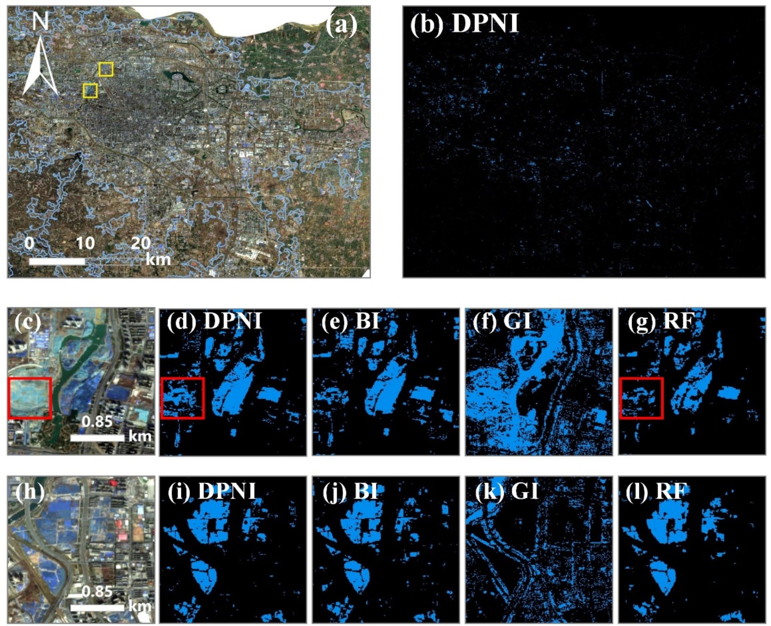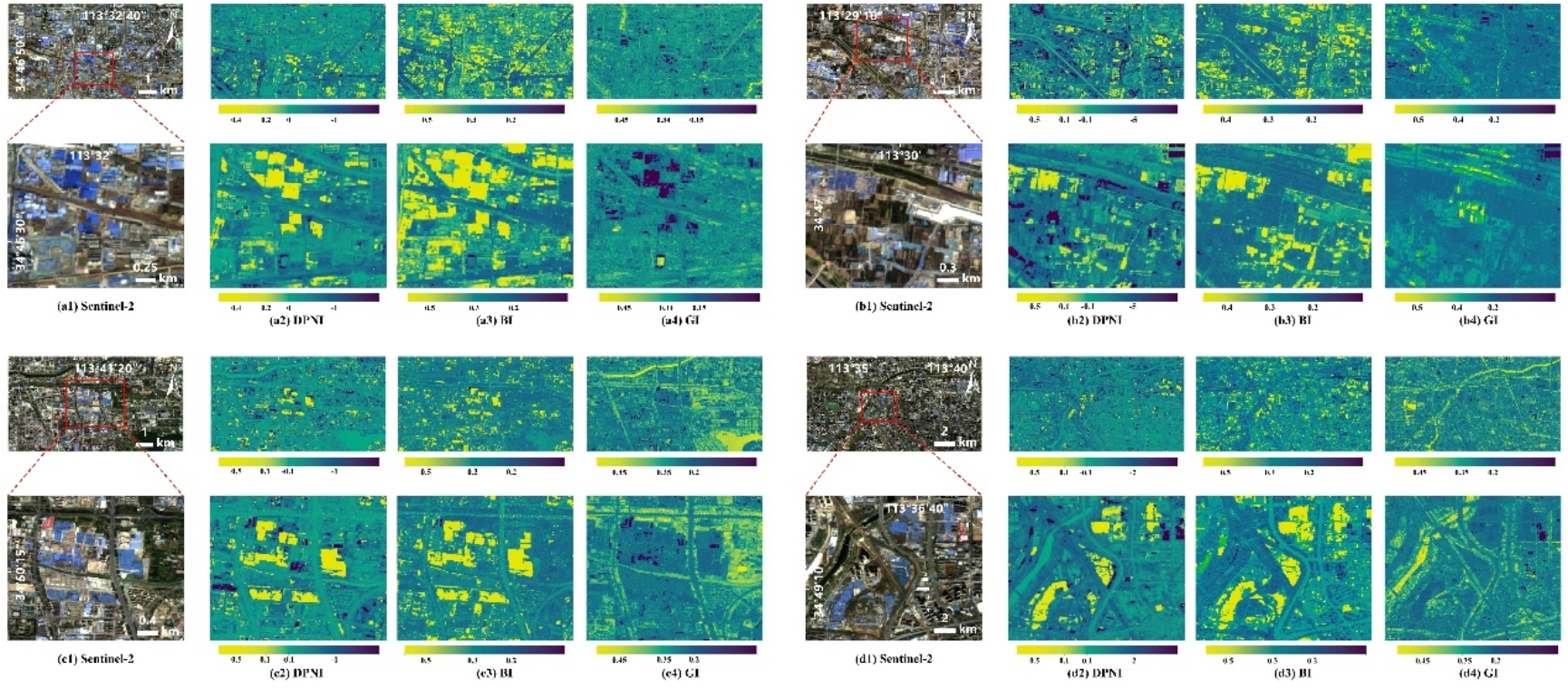 该项研究是在国家自然科学基金面上项目“面向城市建筑系统代谢优化模拟的建筑垃圾遥感精准识别”资助下完成的,该项目主要关注的科研问题是如何通过研究建筑垃圾的多源遥感精准识别方法,优化模拟其来源、分布和去向,以及如何精确揭示城市建筑系统的代谢机理。这篇文章的主要研究内容是针对城市防尘网的制图方法泛化能力和计算速度受限,以及大尺度快速的防尘网制图方法仍然欠缺等问题,利用实地采样的防尘网光谱数据,通过详细分析防尘网的Sentinel-2光谱与城市内典型地物类型的Sentinel-2光谱的差异,创新性地提出了一种新的防尘网光谱指数(DPNI),用于城市防尘网区域的精准识别。DPNI能够很好地突出城市内的防尘网区域,并抑制其他地物类型(图1和图2)。实验结果表明,基于阈值分割方法,DPNI能够准确地识别城市内的防尘网区域,对于两种主要类型的防尘网(蓝色防尘网和绿色防尘网)均有效(图3)。考虑到防尘网覆盖的材料类型多样,研究也基于实地光谱采样数据讨论了防尘网覆盖的不同材料对DPNI有效性的影响。结果表明DPNI能够有效突出覆盖不同材料的两种主要类型防尘网,具有很好的稳定性(图4)。本研究提出的以DPNI为依据的大尺度快速的防尘网制图方法,为进一步提高城市区域内建筑工程用地的遥感识别精度和效率,提供了有效的技术支撑!研究成果可推广用于城市建筑垃圾识别、城市建筑用地变化检测、城市施工区域实时监测等领域的应用!