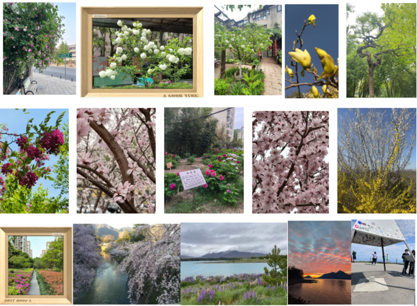 活动得到了退休教师们的热烈响应。参赛作品题材丰富,视角独特:既有家门口盛放的蔷薇、茉莉、山楂等庭院花卉,也有上田城樱花、永定河孔雀城白玉兰、心形树、槐花等城市景观;既有南苑湿地公园的烂漫春色,也不乏新西兰鲁冰花、美加边境夕阳等异域风情。特别值得一提的是,还有老师专门拍摄了瑞士首个大地控制点,展现了测绘人独特的专业视角。