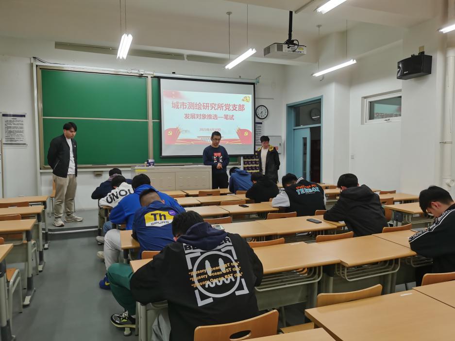 为进一步深入贯彻习近平新时代中国特色社会主义思想,提升积极分子对党的性质、宗旨、奋斗目标和现阶段任务的认知水平,检验积极分子党课学习成果,端正入党动机,严把党员发展对象质量关,规范党员发展流程,城市测绘研究所党支部于4月10日晚19:30在学F312开展党员发展对象选拔考试,并将此作为党员发展的重要考核依据。考试由党支部书记陈铮主持。