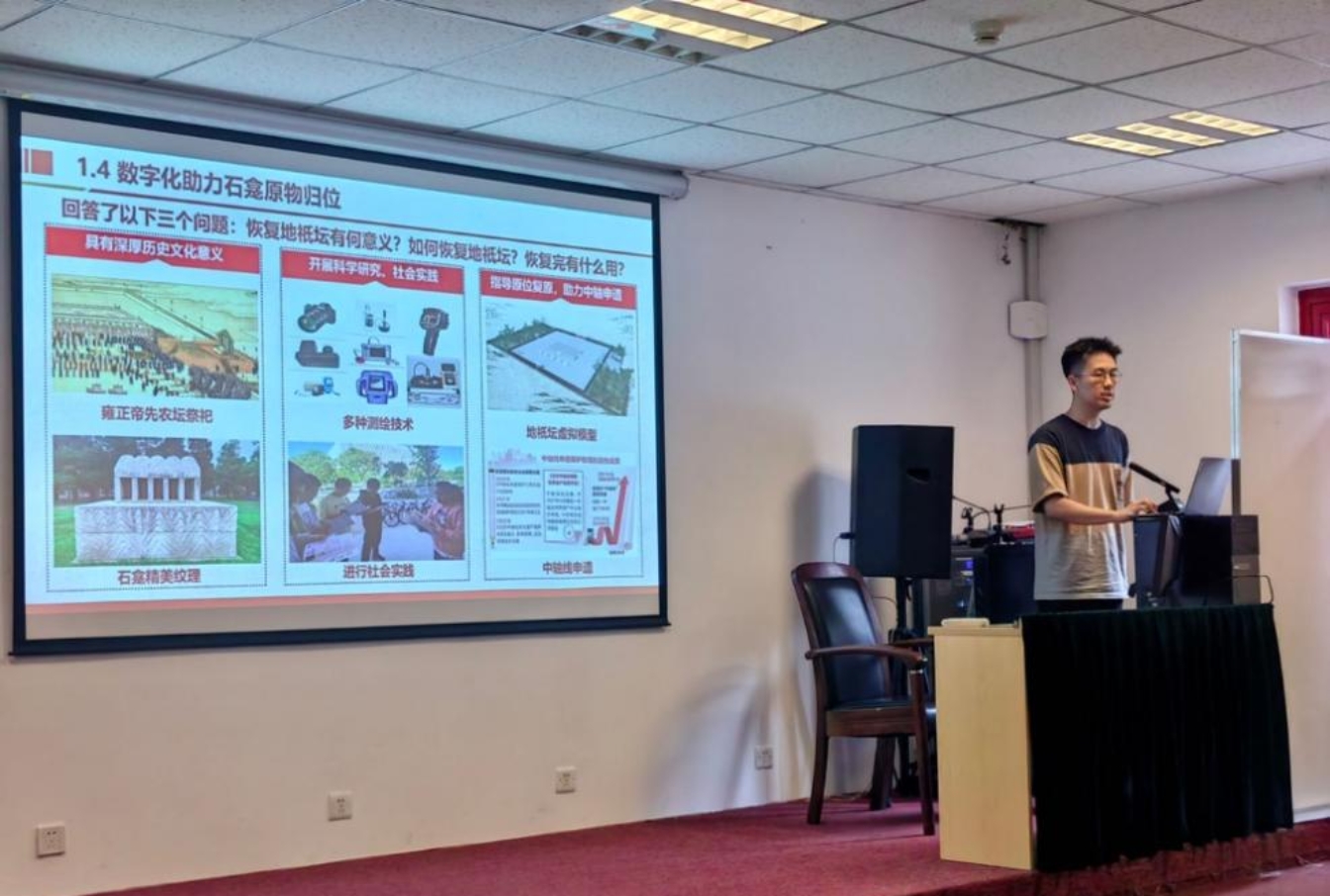 刘欣阳同学介绍了2023年红色1+1项目"先农坛之地祇坛石龛病害保护及数字化复原"的研究成果。项目团队围绕先农坛的文化价值与保护意义,从时空知识图谱构建、时空变迁研究、病害调查、复原展示四个方向开展工作,取得了丰硕的阶段性成果,为今年的实践活动提供了宝贵经验。