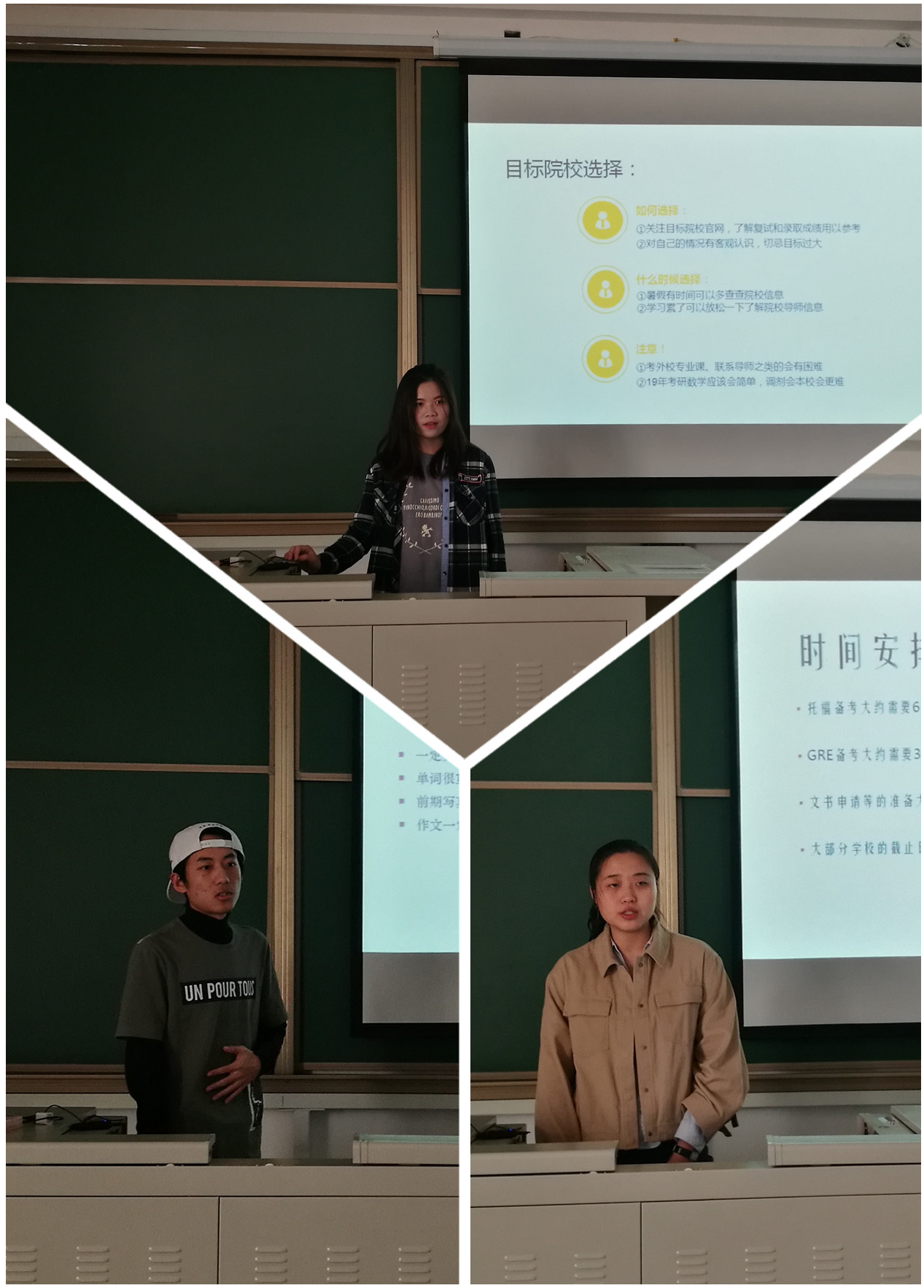 随后,14级考研留学学生代表依次分享备考经验。测141班蒋永慧为同学们提出很多实用建议,包括考研各科的复习方法、备考心态的调整、备考过程的规划等;以优异成绩考取北京师范大学的地141班丰怀泽结合自身经验分享了院校专业的选择和复试方面的一些心得,他提醒同学们“考研要耐得住寂寞”;收到美国波士顿大学offer的遥141班齐丹阳分享了自己申请出国留学的历程,在学校选择、申请流程、语言考试准备等方面给同学们提供了很多有用建议。