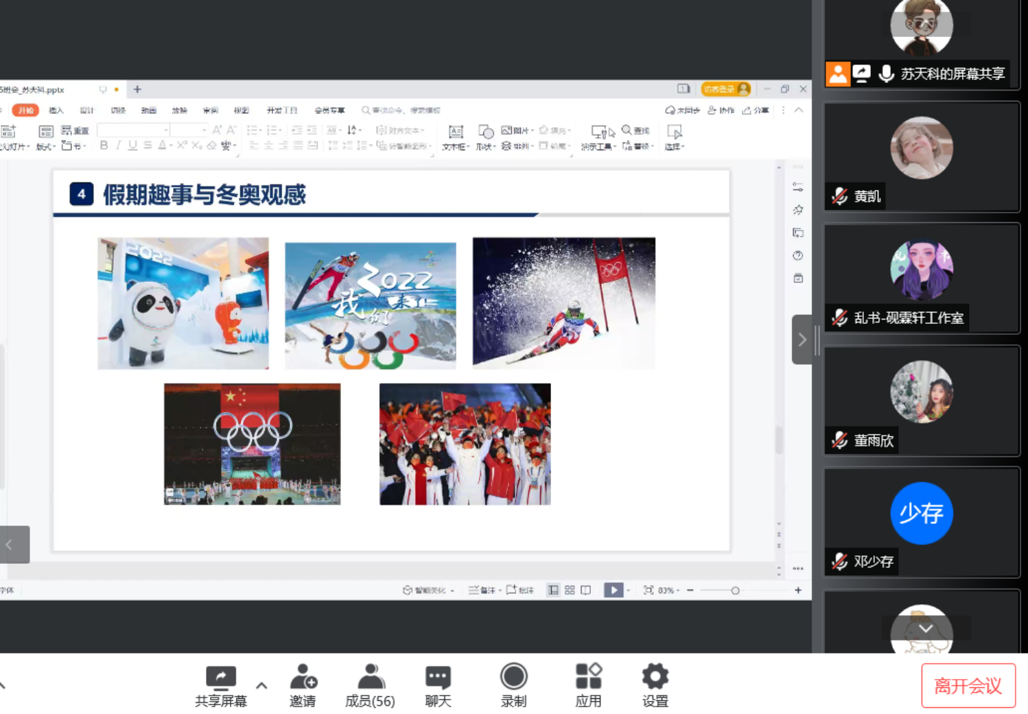 各支部成员还从冬奥的角度出发,交流和分享了观赛感受和自己的感悟体会,进一步激发了同学们的爱国情怀,加强了作为青年自身的责任感和使命感。青年一代要弘扬奥运精神,不怕苦,不怕累,明白民族之希望在于青年,不忘初心,牢记使命,以梦为马,不负韶华!