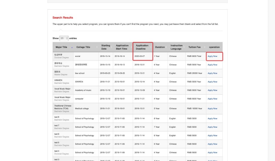 Click‘Apply Now’ to enter the of major list (select the major which the deadline is not arrived):
